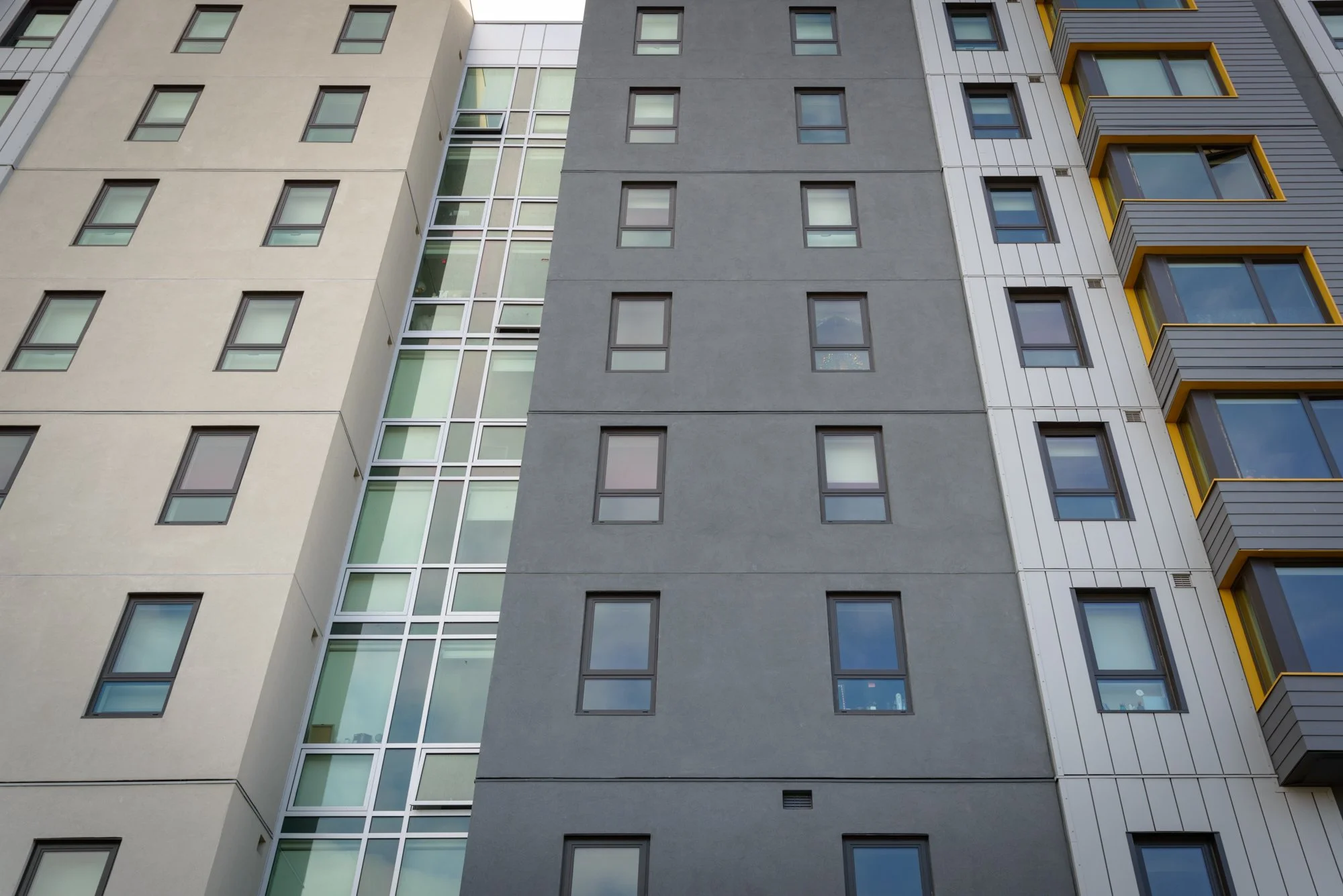 The Manzanita Square dorm is part of San Francisco State University’s push to create more affordable housing for its student body, adding 597 much-needed beds to the student-housing stock. I partnered with my longtime client, Build Group, to showcase various phases throughout the construction process. For me, watching projects transform from demo to completion and occupation never gets old. Build Group also asked me for a few additional images focused on the exterior cladding and fine interior detail of the main amenities space. I opted to shoot these on a weekend morning after a rainstorm when the streets were still wet, which really added to the dramatic effect of the exterior hero images.
