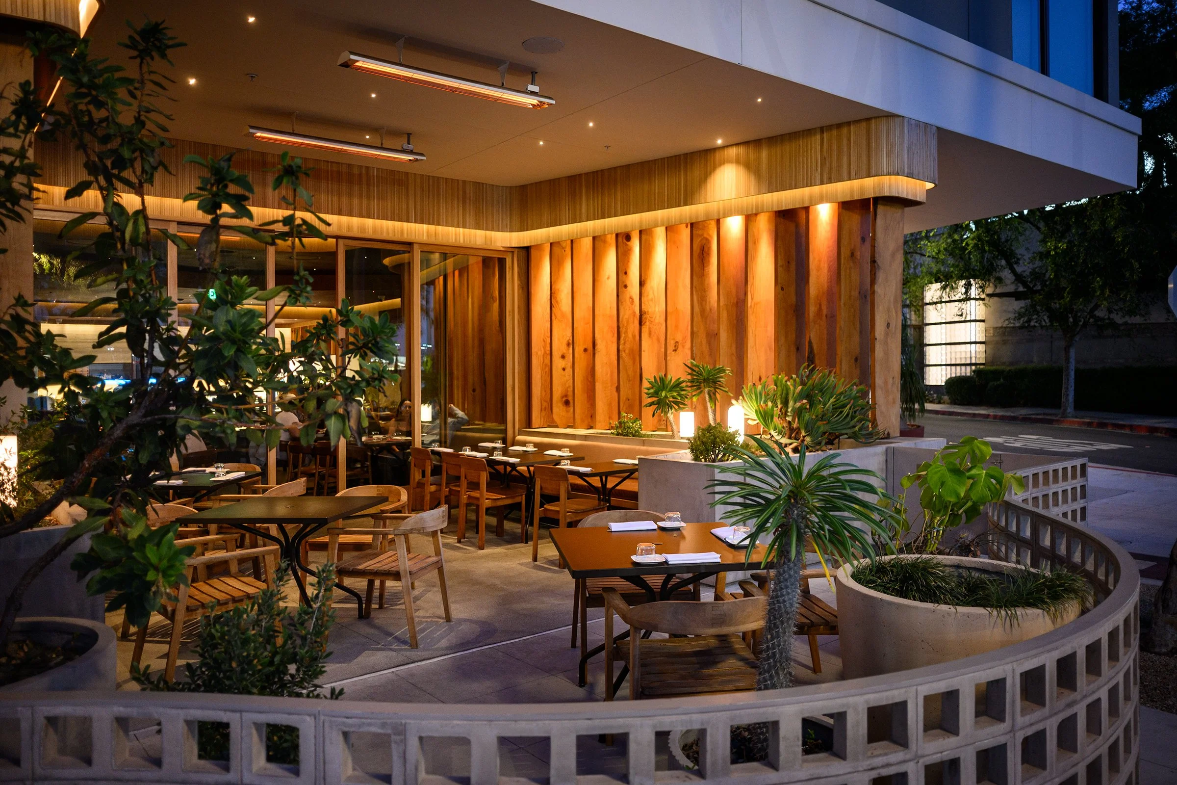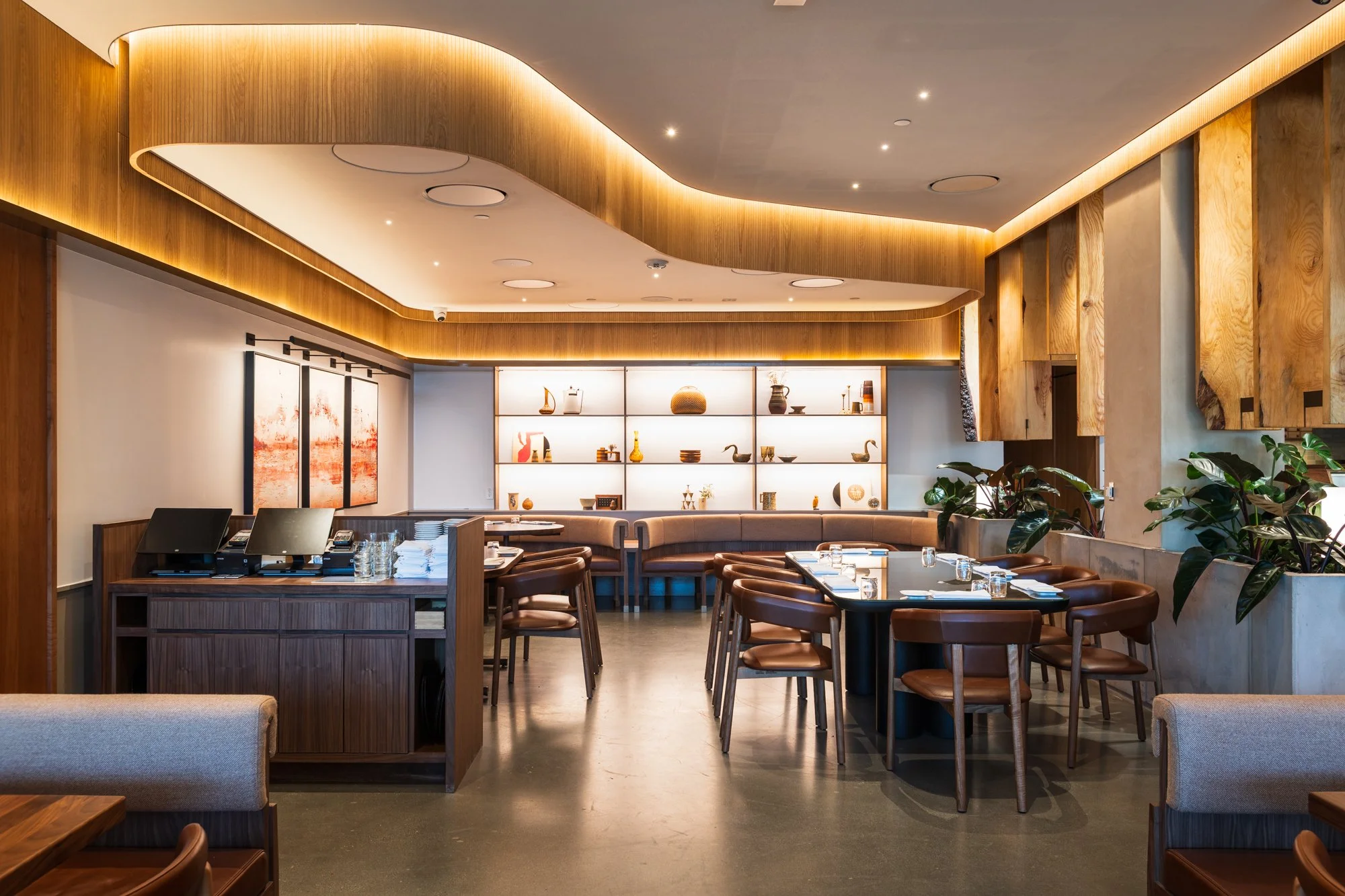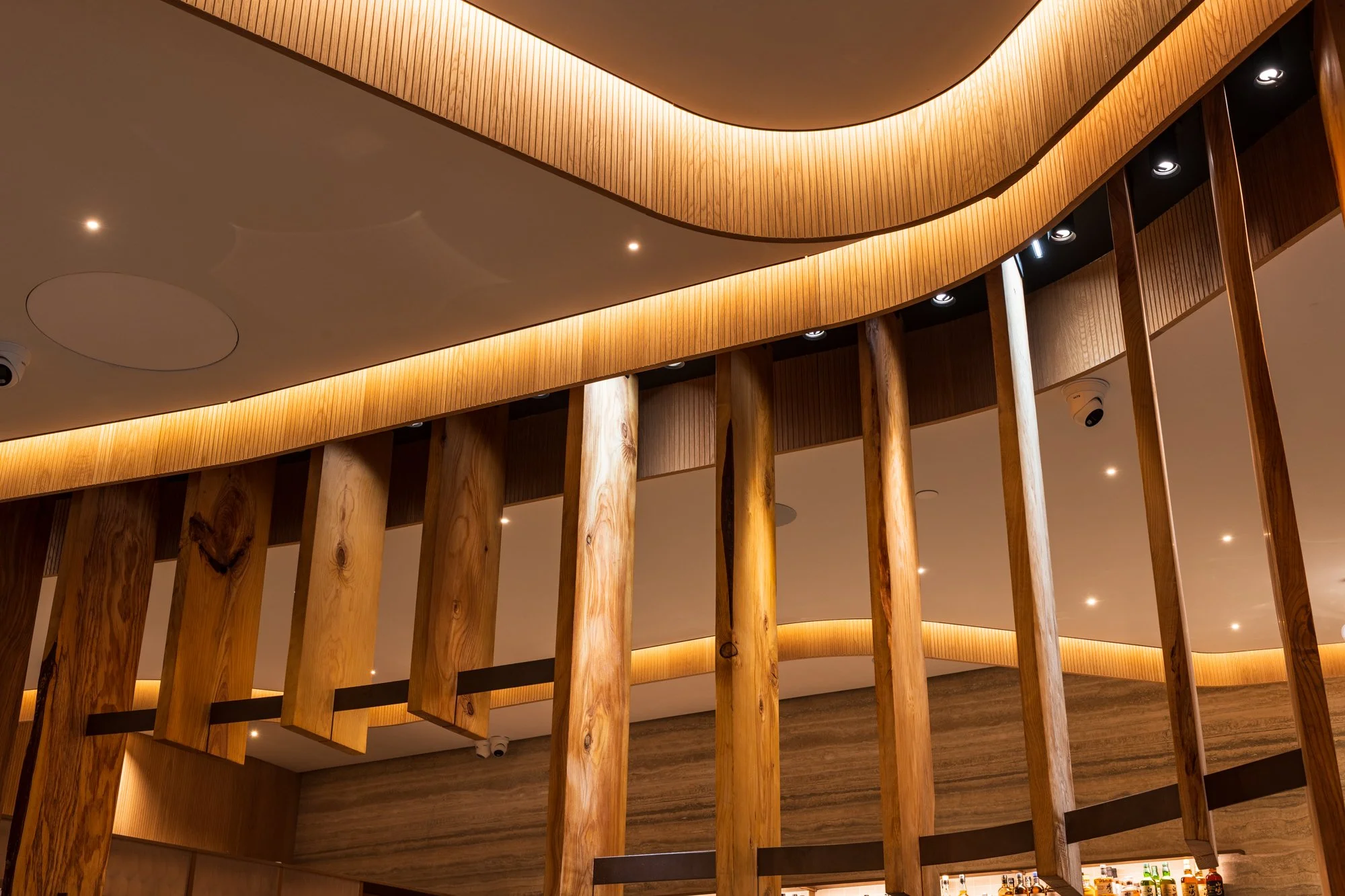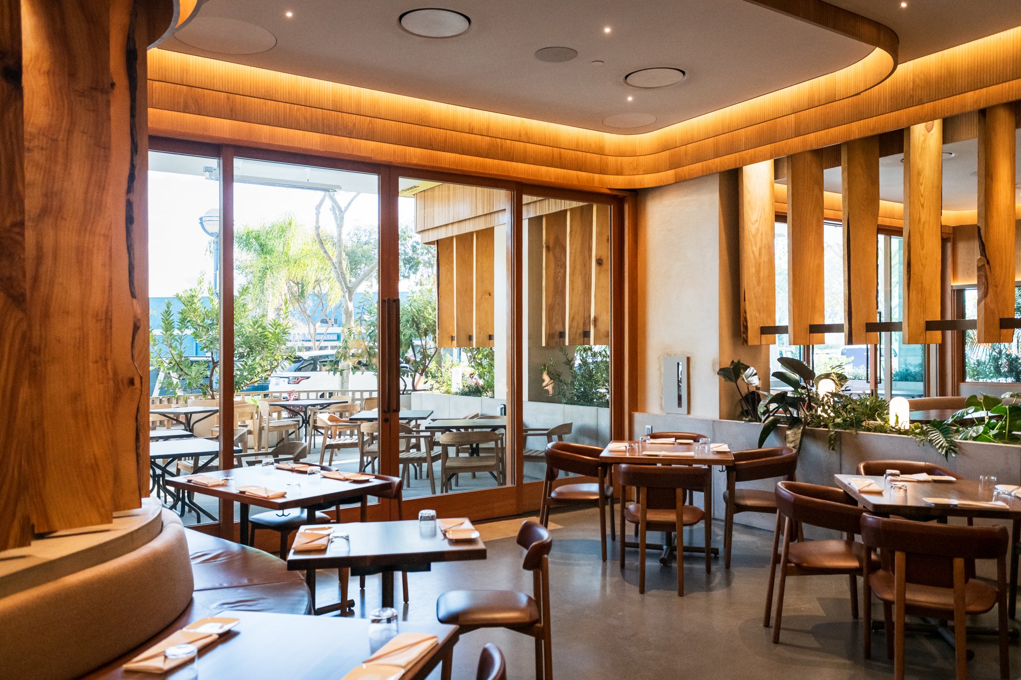 Uchi, meaning home, was designed to mix calculated Japanese design with the essence of Southern California contemporary-modern design. One of the most interesting aspects of this project is the millwork. All lumber was sourced locally from fallen and removed trees around LA County via Angel City Lumber. Japanese-inspired joinery was made visible to celebrate the design rather than conceal it, and showcasing the imperfect, organic nature of the slabs pays homage to the Japanese philosophy of wabi-sabi – finding beauty in imperfection and the natural cycle of growth and decay. Nearly 26 tons of timber were milled and upcycled into this space, creating a warm and welcoming dining experience. The exquisite lighting design really brings it home.